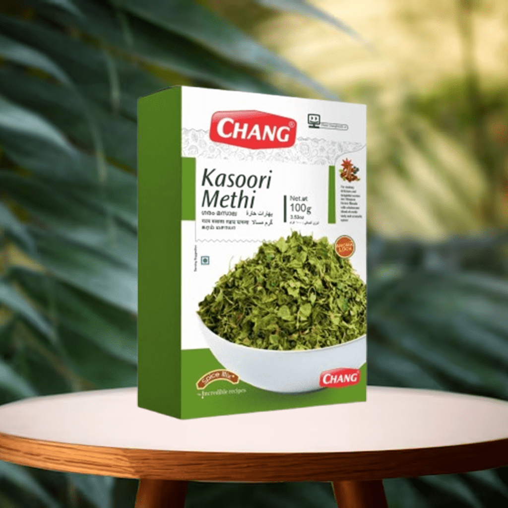 Dried fenugreek leaves with distinct maple-like aroma and bitter-sweet taste.